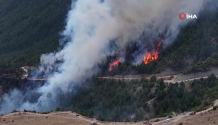 Yaklaşık 1,5 saat önce başlayan yangına çevre ilçelerden sevk edilen çok sayıda itfaiye aracı, arazöz ve su tankeriyle müdahale ediliyor.