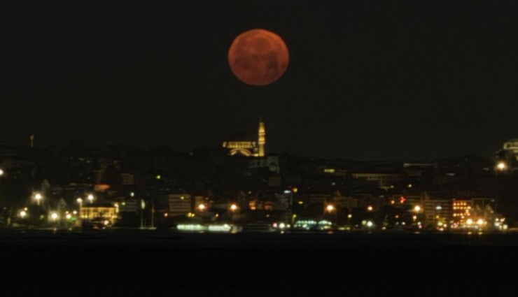 İstanbul'da 18 yıl aradan sonra görüntülenen, pembe ve kehribar renkli "Çilek Dolunayı" Beşiktaş ilçesi Ortaköy mevkiinde gecenin ilerleyen saatlerinde görüntülendi.