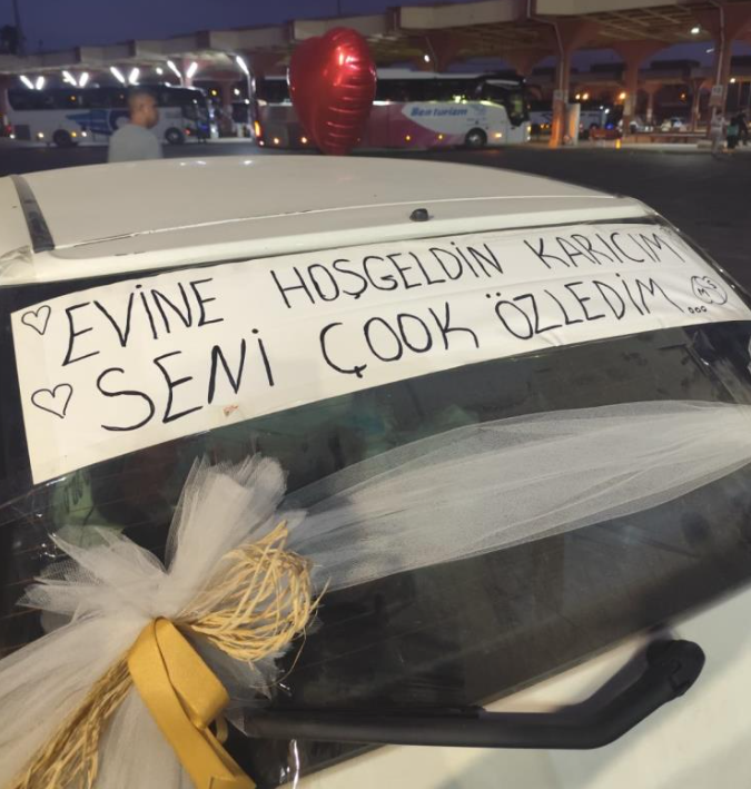 Adana’da yaşayan Sadık Şaşmaz (29), hamile eşi Melek Şaşmaz’ı (25) bir ay kaldığı Batman’dan dönüşünde otogarda süslediği otomobil ve hazırladığı yazılarla karşıladı. Şehir Hastanesi’nde ISS Türkiye firmasına bağlı temizlik görevlisi olarak çalışan Şaşmaz’ın bu sürprizi sosyal medyada büyük ilgi gördü.