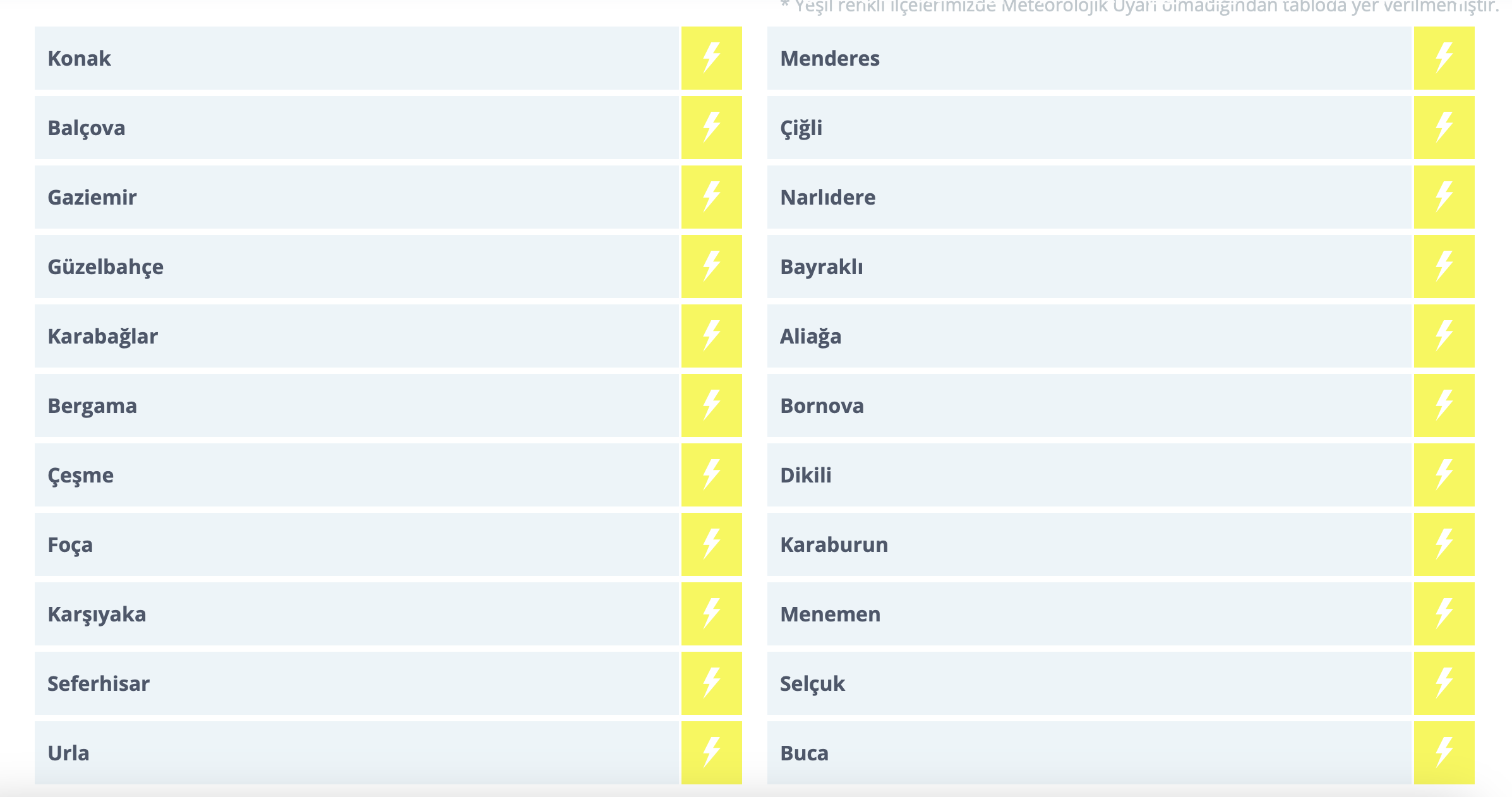Bergama, Dikili, Foça, Menemen, Aliağa, Karşıyaka, Çiğli, Bayraklı, Bornova, Buca, Gaziemir, Karabağlar, Konak, Balçova, Güzelbahçe, Narlıdere, Urla, Karaburun, Çeşme, Seferihisar, Menderes ve Selçuk.