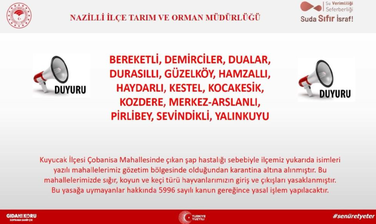 Nazilli İlçe Tarım ve Orman Müdürlüğü tarafından alınan karar doğrultusunda Bereketli, Demirciler, Dualar, Durasıllı, Güzelköy, Hamzallı, Haydarlı, Kestel, Kocakesik, Kozdere, Merkez Arslanlı, Pirlibey, Sevindikli ve Yalınkuyu mahallelerinde hayvan giriş çıkışları yasaklandı.