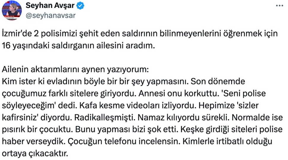 “Kim ister ki evladının böyle bir şey yapmasını. Son dönemde çocuğumuz farklı sitelere giriyordu. Annesi onu korkuttu. 'Seni polise söyleyeceğim' dedi. Hepimize 'sizler kafirsiniz' diyordu. Radikalleşmişti. Namaz kılıyordu sürekli. Normalde ise pısırık bir çocuktu. Bunu yapması bizi şok etti. Keşke girdiği siteleri polise haber verseydik. Çocuğun telefonu incelensin. Kimlerle irtibatlı olduğu ortaya çıkacaktır.”