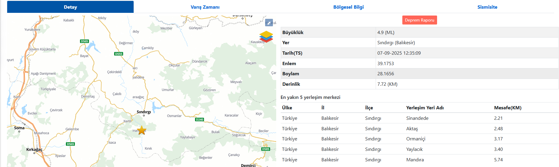 Balıkesir’in Sındırgı ilçesinde öğle saatlerinde deprem meydana geldi. AFAD verilerine göre saat 12.35’te kaydedilen depremin büyüklüğü 4.9, derinliği ise 7.7 kilometre olarak belirlendi. Merkez üssü Sındırgı olan deprem İzmir, Manisa ve çevre illerde de hissedildi
