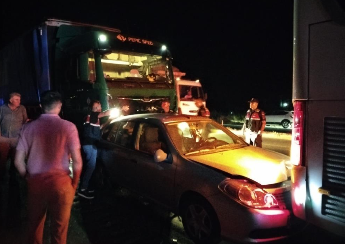 Edinilen bilgiye göre, Çanakkale-İzmir kara yolunun Ayvalık Altınova Mahallesi girişinde meydana gelen kazada, kırmızı ışıkta bekleyen 07 BMH 278 plakalı yolcu otobüsü, arkasındaki 06 DA 5150 plakalı otomobil ve onun arkasındaki yabancı plakalı tır, 63 ADJ 826 plakalı kamyonun çarpmasıyla birbirine girdi.