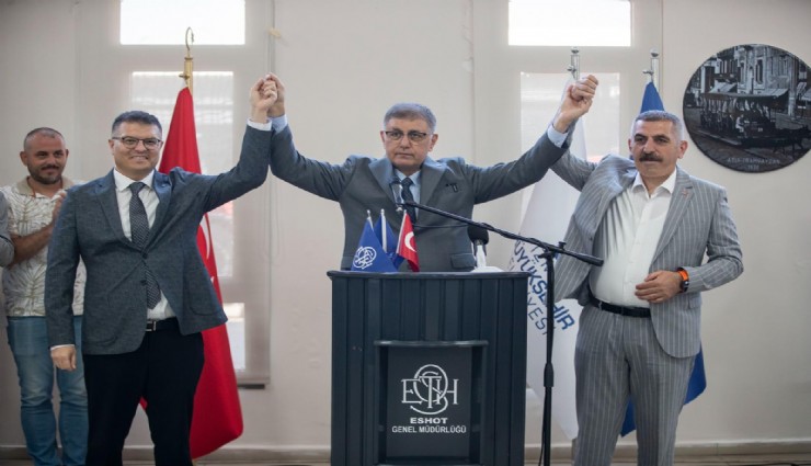 DİSK Genel İş Sendikası 1 No'lu Şube Başkanı Engin Topal, ESHOT Genel Müdürü ve İzmir Büyükşehir Belediyesi Genel Sekreter Yardımcısı Övünç Özgen ile birlikte el ele personele seslenen Tugay, şunları söyledi.