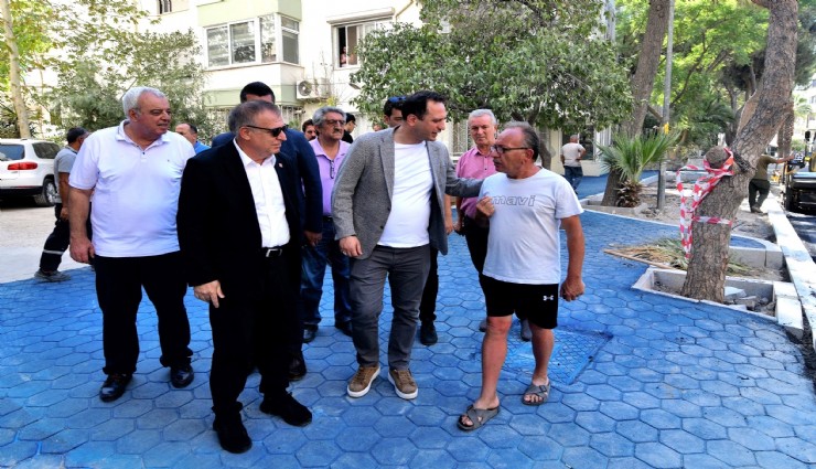 Mavi renkli kaldırımları ve baskı asfaltıyla dikkat çeken sokakta incelemelerde bulunan Bornova Belediye Başkanı Ömer Eşki, CHP Genel Başkan Yardımcısı Gökan Zeybek ile birlikte çalışmaları yerinde gördü.
