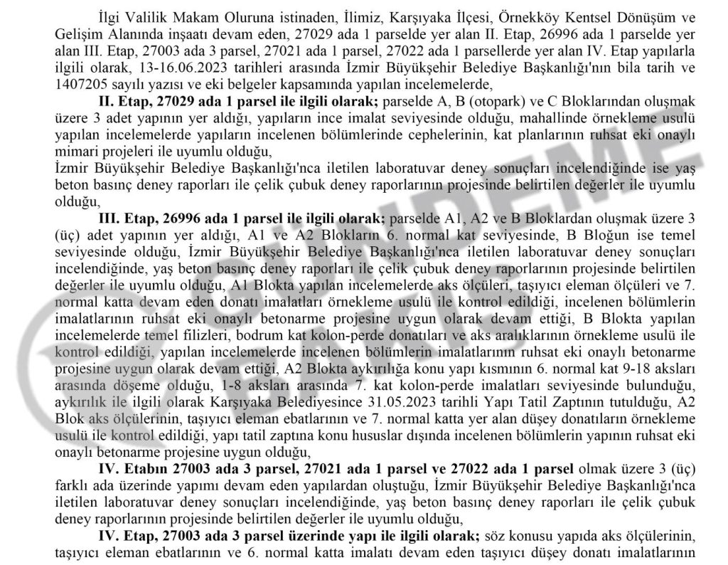 İlgi Valilik Makam Oluruna istinaden, İlimiz, Karşıyaka İlçesi, Örnekköy Kentsel Dönüşüm ve Gelişim Alanında inşaatı devam eden, 27029 ada 1 parselde yer alan II. Etap, 26996 ada 1 parselde yer alan III. Etap, 27003 ada 3 parsel, 27021 ada 1 parsel, 27022 ada 1 parsellerde yer alan IV. Etap yapılarla ilgili olarak, 13-16.06.2023 tarihleri arasında İzmir Büyükşehir Belediye Başkanlığı'nın bila tarih ve 1407205 sayılı yazısı ve eki belgeler kapsamında yapılan incelemelerde,