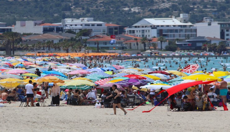 İzmir'in en ünlü ve gözde tatil noktalarından biri olan Çeşme'de bayram yoğunluğu yaşanıyor. İlçenin nüfusu bayramın ikinci günü itibariyle 1 milyonu aşarken, otellerde doluluk oranı ise yüzde 90'ı buldu. Çeşme'nin en ünlü plajlarından biri olan Ilıca Plajı'nda yaşanan yoğunluk göze çarptı. 3 kilometrelik şeridi olan ünlü plaja gelen vatandaşlar, kumsalları hıncahınç doldurdu. Bazı vatandaşlar yüzerek vakit geçirirken, bazıları da güneşlenmeyi tercih etti. Ilıca Plajı'nda oluşan kalabalık havadan görüntülendi.