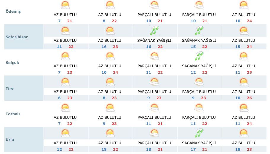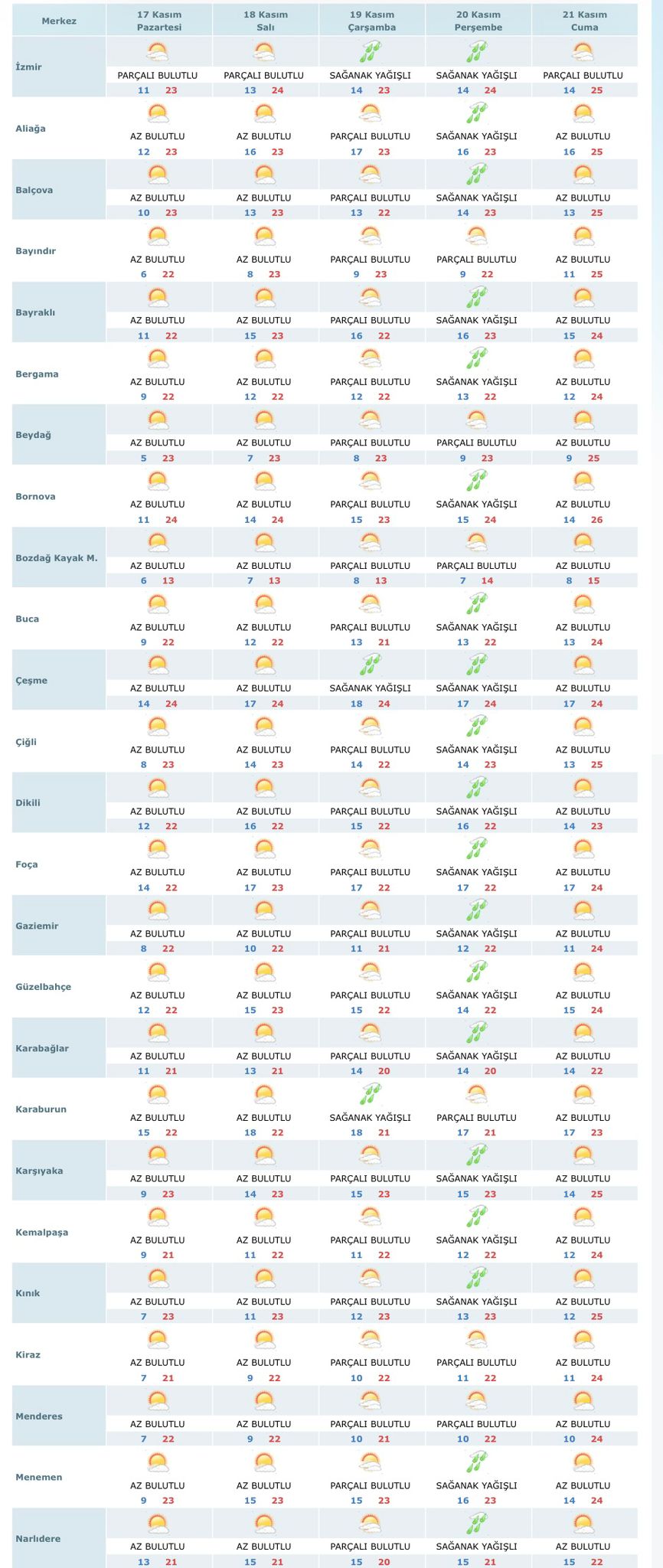 Pazartesi ve salı günleri çoğu merkezde güneş zaman zaman kendini gösterirken, çarşambadan itibaren özellikle Merkez, Çeşme, Foça, Karabağlar, Karaburun, Menemen, Narlıdere ve Bornova gibi ilçelerde yağış etkili olacak.