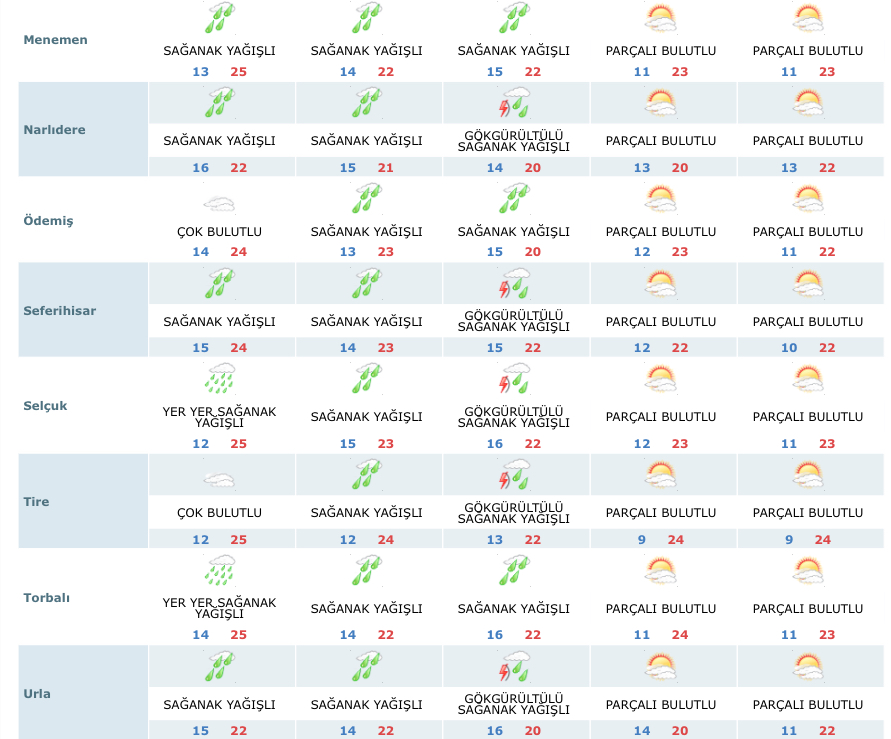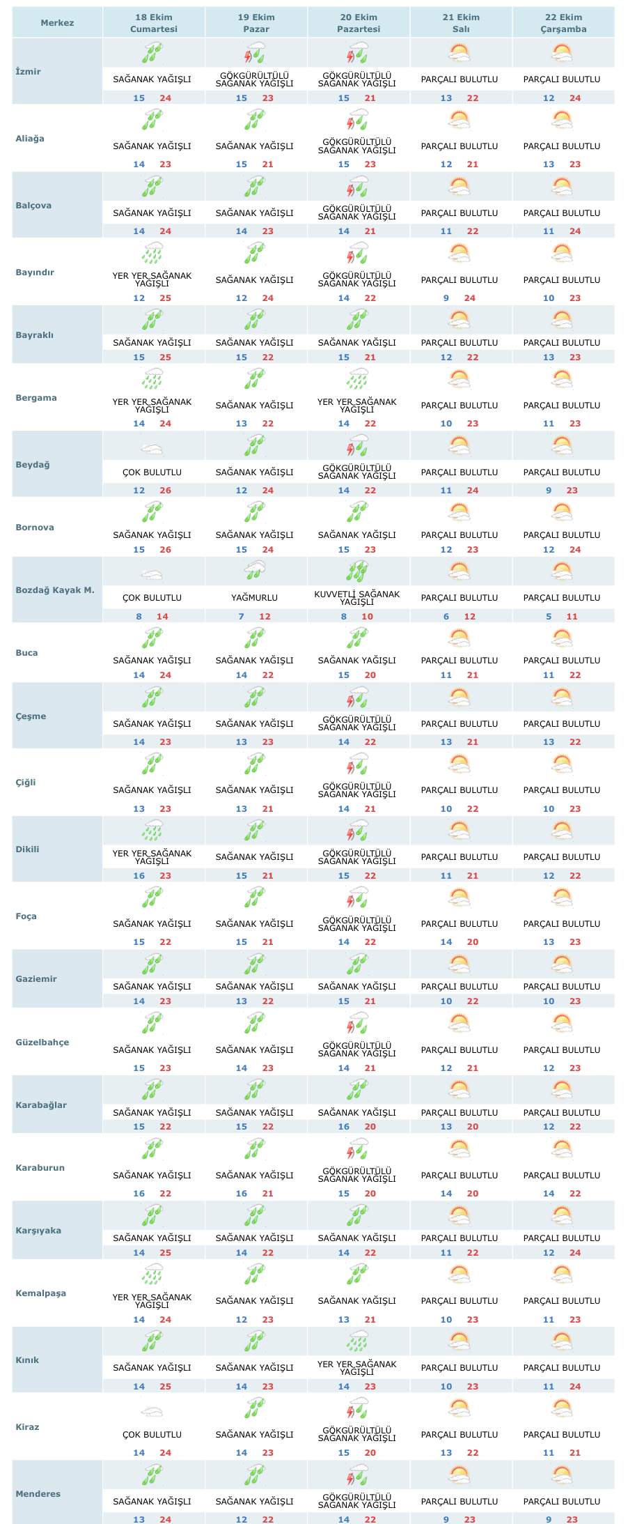 İzmir genelinde hafta sonu sağanak ve gök gürültülü sağanak yağışlar etkili olacak. Meteoroloji verilerine göre 18 Ekim Cumartesi günü kent genelinde sağanak yağış, 19 ve 20 Ekim’de ise gök gürültülü sağanak yağış bekleniyor.
