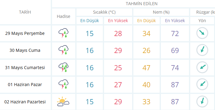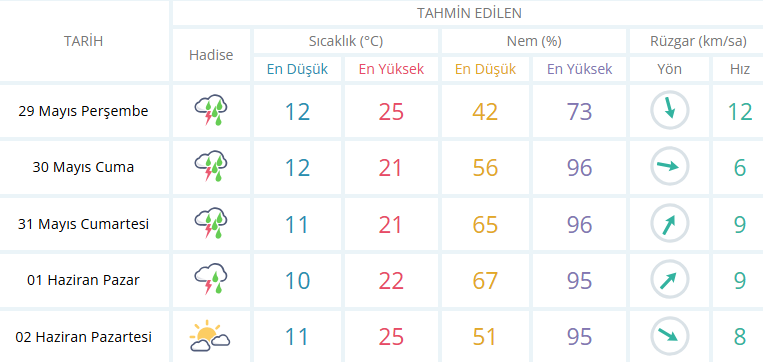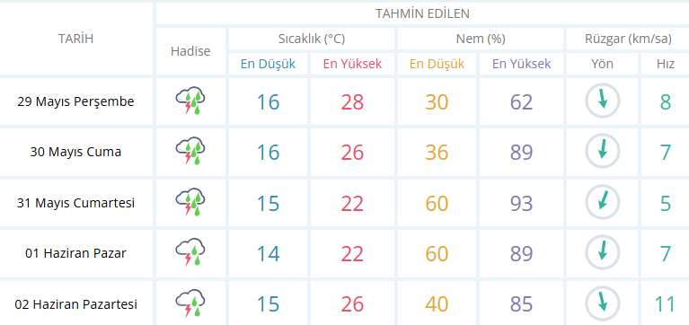 İzmir'de yaz aylarının gelmesiyle son haftalarda hafta sonları yağışlı geçiyor. İzmir'de ise yeni hafta da 31 Mayıs Cumartesi ve 1 Haziran Pazar günü hava gök gürültülü ve sağanak yağışlı olacak. Ortalama sıcaklık ise 22 derece olacağı tahmin edilirken Cumartesi günü kuvvetli gök gürültülü sağanak yağış beklentisi var. Pazar günü ise yağış etkisini azaltarak devam edeceği tahmin ediliyor.
