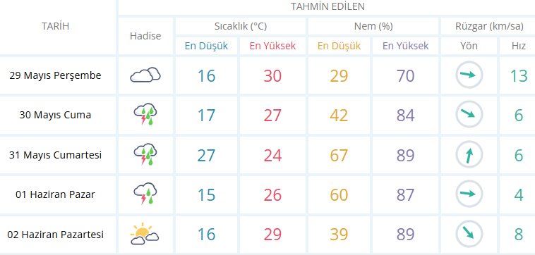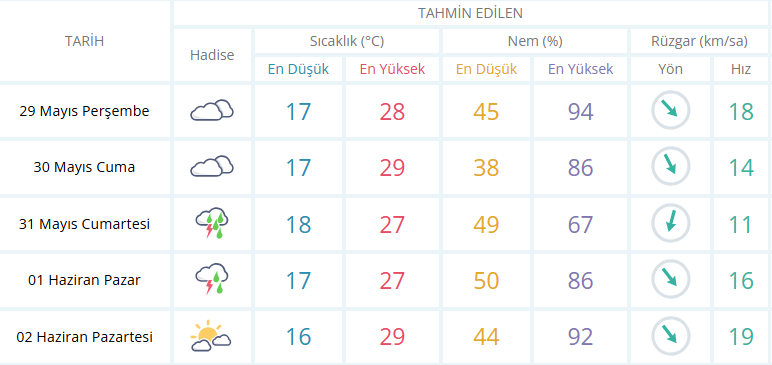 Manisa'da yeni hafta da 29 Mayıs Perşembe, 30 Mayıs Cuma, 31 Mayıs Cumartesi ve 1 Haziran Pazar günü hava gök gürültülü ve sağanak yağışlı olacak. Ortalama sıcaklık ise 20 derece olacağı tahmin edilirken Perşembe, Cuma ve Pazar günü gök gürültülü sağanak yağış beklentisi var. Cumartesi ise günü ise kuvvetli gök gürültülü sağanak yağış etkil olacak.