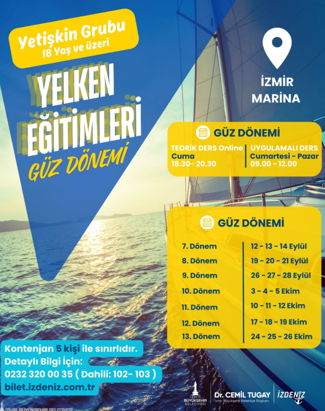 Cuma günleri online teorik, cumartesi ve pazar günleri İzmir Marina’da uygulamalı olarak gerçekleştirilecek eğitimlerde kontenjan 5 kişiyle sınırlı tutuldu. 18 yaş ve üzeri katılımcılara açık olan eğitimlerin ücreti 6.000 TL olarak belirlendi. Kayıtlar bilet.izdeniz.com.tr adresinden yapılabilirken, ayrıntılı bilgi almak isteyenler için 0232 320 00 35 (Dahili 102–103) numaralı telefon kullanılabiliyor.