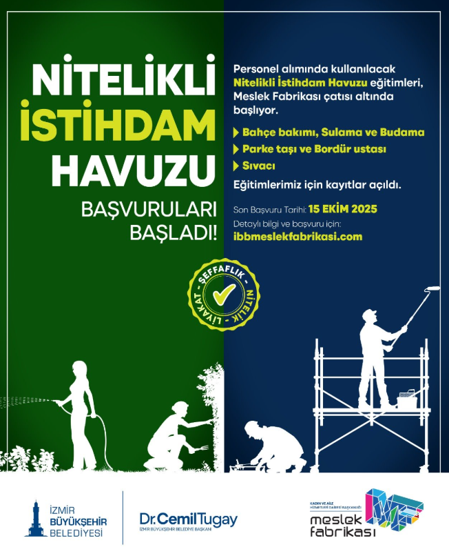 İzmir Büyükşehir Belediyesi, personel alımında şeffaf ve liyakate dayalı yeni bir sistemi hayata geçiriyor. Meslek Fabrikası’nın belirli branşlardaki eğitimlerini başarıyla tamamlayan kursiyerler, artık “Nitelikli İstihdam Havuzu”na dahil edilecek. Belediyede personel ihtiyacı oluştuğunda işe alım süreçleri bu havuz üzerinden yürütülecek. Yeni eğitimler için son başvuru tarihi 15 Ekim olarak belirlendi.