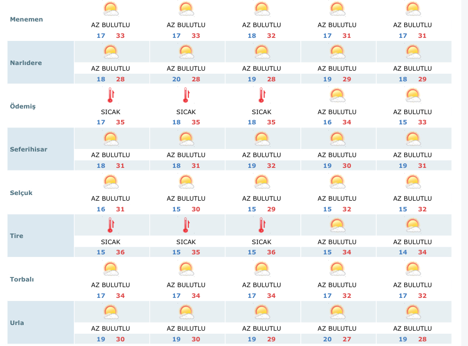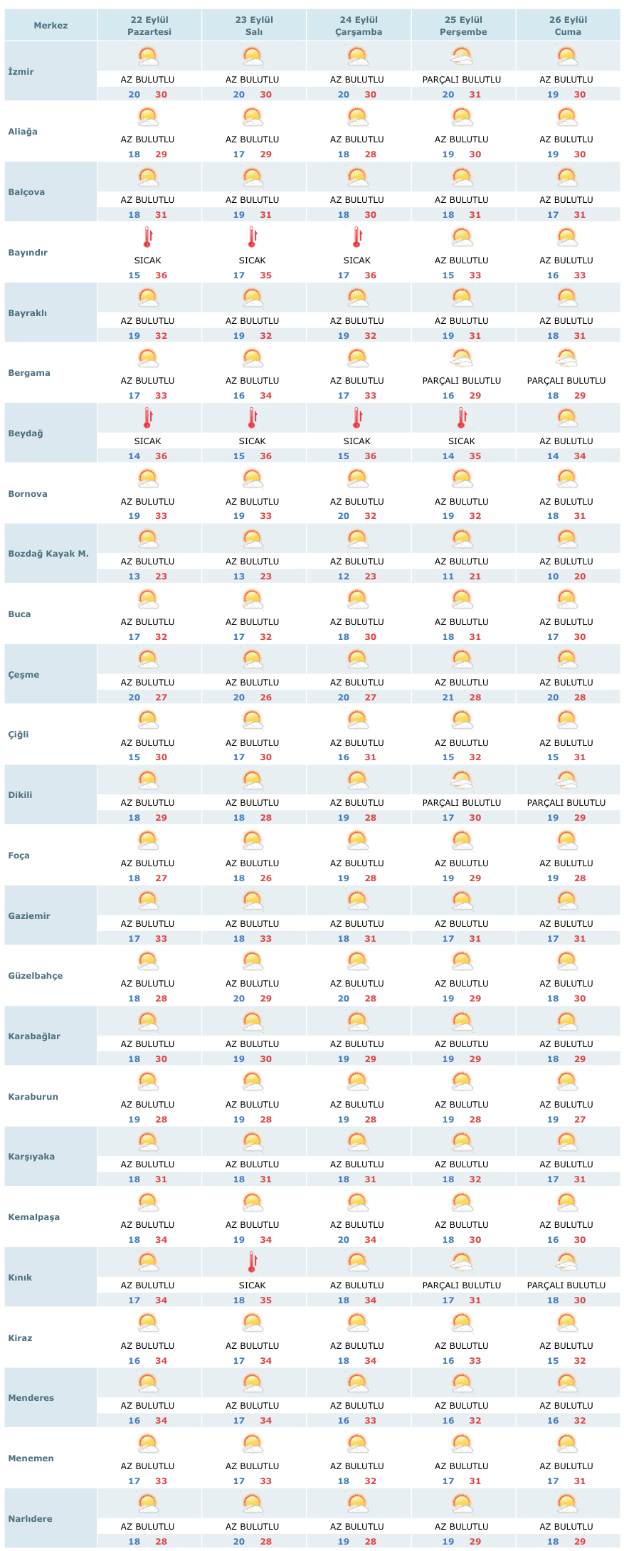 Meteoroloji Genel Müdürlüğü İzmir'in ilçeleri için hava durumu tahminini yayımladı. 22-26 Eylül tarihleri arasında kent genelinde az bulutlu ve sıcak bir hava hakim olacak. Sıcaklıklar iç kesimlerde 36 dereceye kadar çıkarken kıyı ilçelerde 27-33 derece arasında seyredecek. Bayındır, Ödemiş ve Tire’de termometreler 35-36 dereceyi gösterecek. İzmir merkezde ise hafta boyunca gündüz 30-31, gece 19-20 derece bekleniyor.