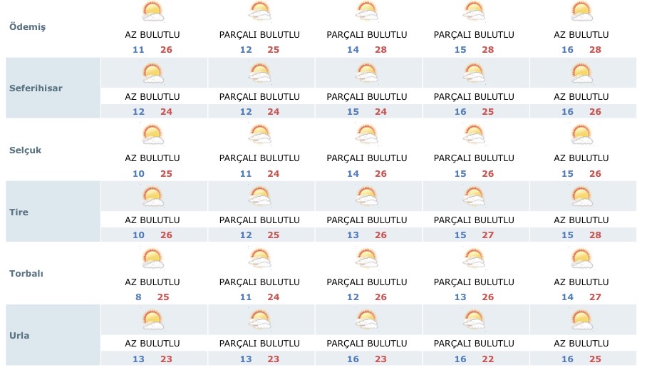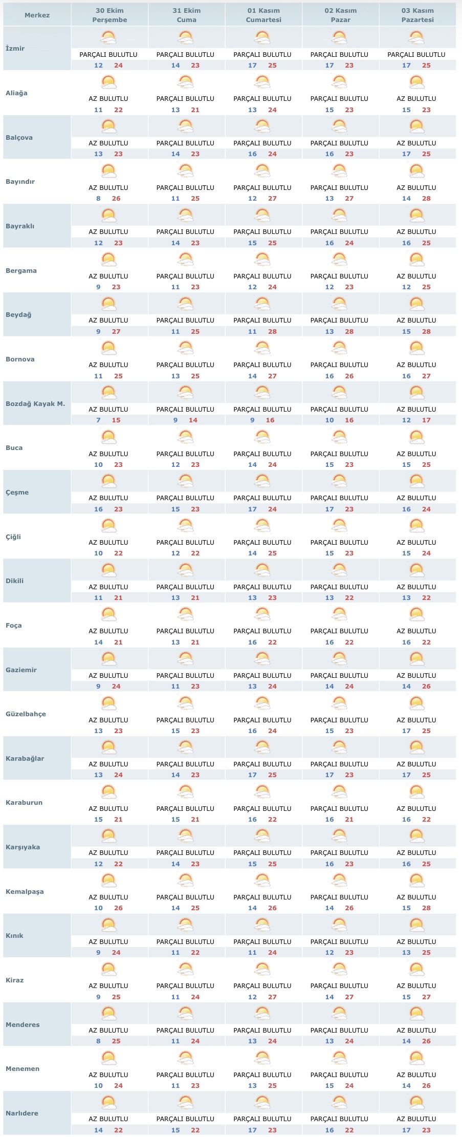 İzmir ve ilçelerinde hava durumu hafta boyunca genel olarak parçalı bulutlu geçecek.