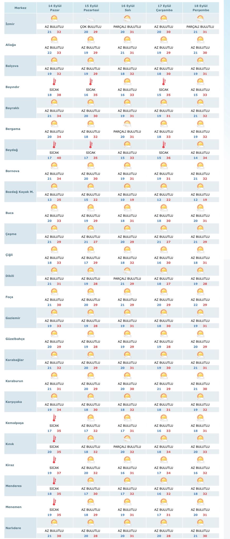 İzmir'de önümüzdeki hafta boyunca yaz etkisini sürdürmeye devam edecek. Meteoroloji verilerine göre özellikle iç kesimlerde sıcaklıklar 35°C'nin üzerine çıkarken, kıyı bölgelerde ise az bulutlu ve sıcak bir hava hâkim olacak. İşte ilçelere göre hava durumu verileri: