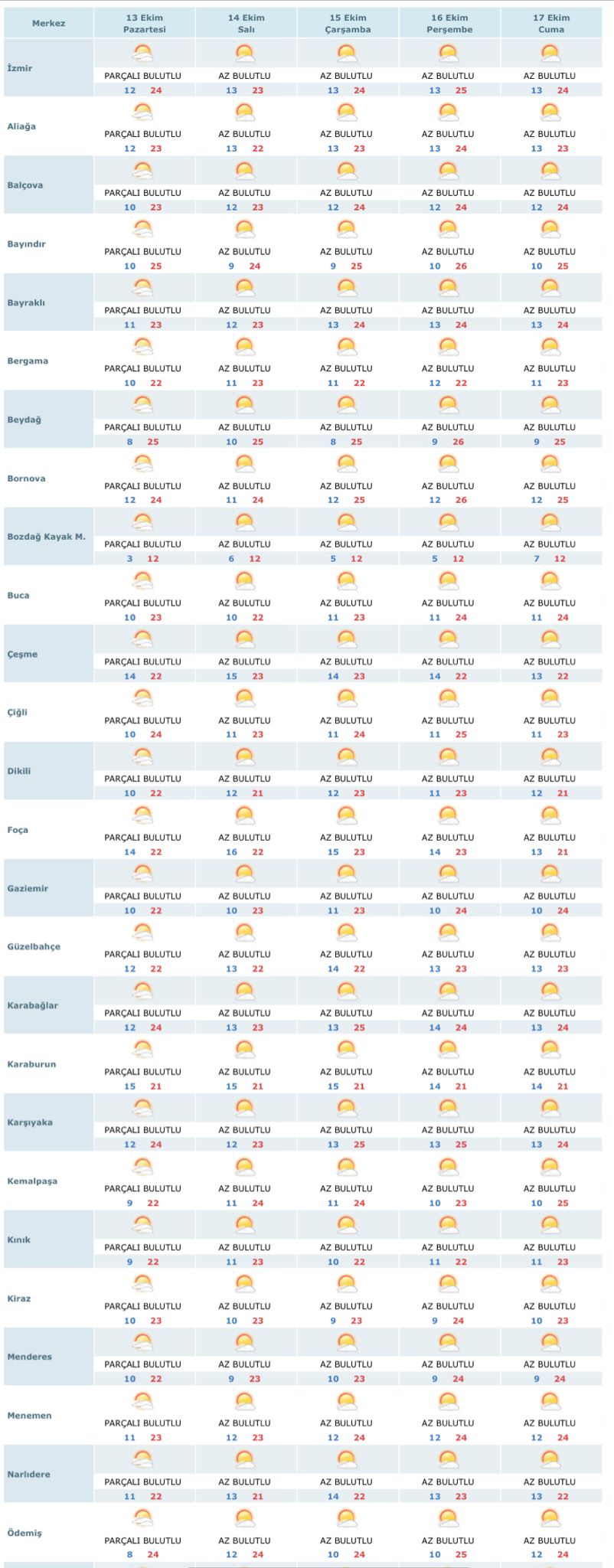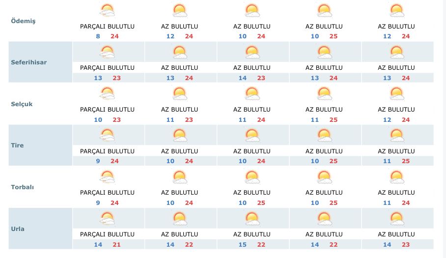 Gündüz sıcaklıkları 21–26°C arasında değişirken, gece sıcaklıkları özellikle iç kesimlerde 3°C’ye kadar düşebiliyor. Kıyı bölgelerde ise gece sıcaklıkları 10–15°C civarında seyredecek. İşte İzmir'in ilçeleri için bir haftalık hava durumu: