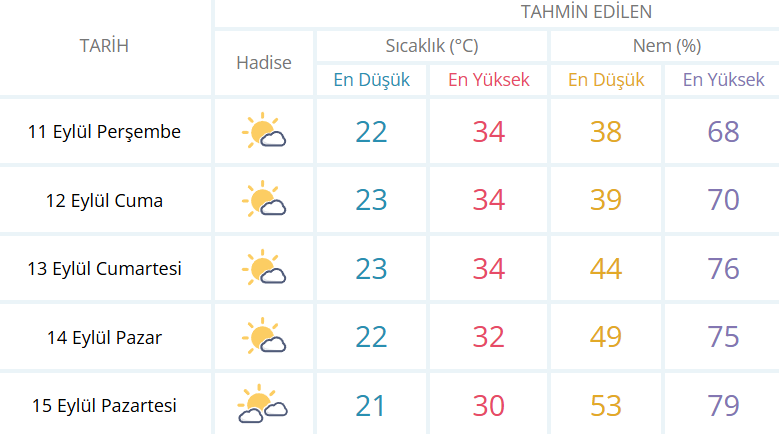 İzmir'in 5 günlük genel hava durumu tahmini ise şöyle: