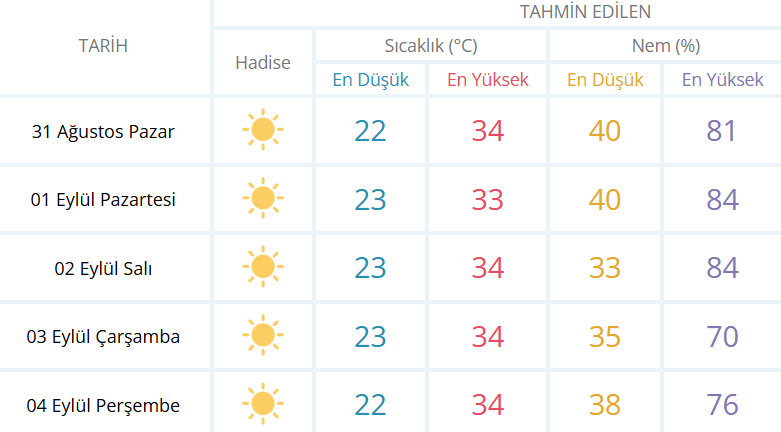 İzmir için 5 günlük genel hava raporu ise şu şekilde:
