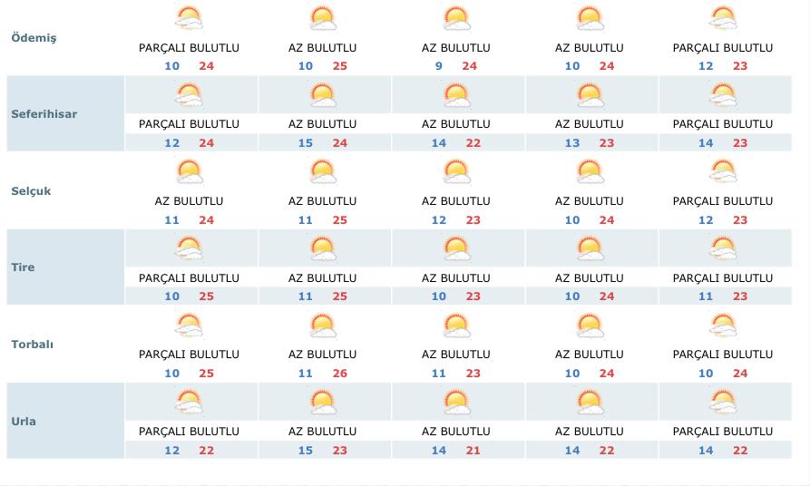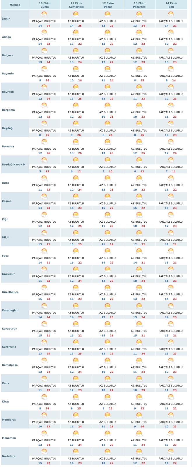 Metereoroloji Genel Müdürlüğü İzmir'in ilçeleri için 5 günlük hava durumu tahminini yayınladı. Verilere İzmir'de yağış beklenmezken ılıman havaların hafta boyunca devam etmesi bekleniyor