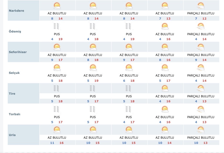 Torbalı, Tire, Selçuk ve Seferihisarda hava genel olarak az bulutlu geçecek; sıcaklıkların 4–18 derece bandında seyredeceği tahmin ediliyor. Bergama ve Beydağ’da ise pusun zaman zaman etkisini artırması bekleniyor.