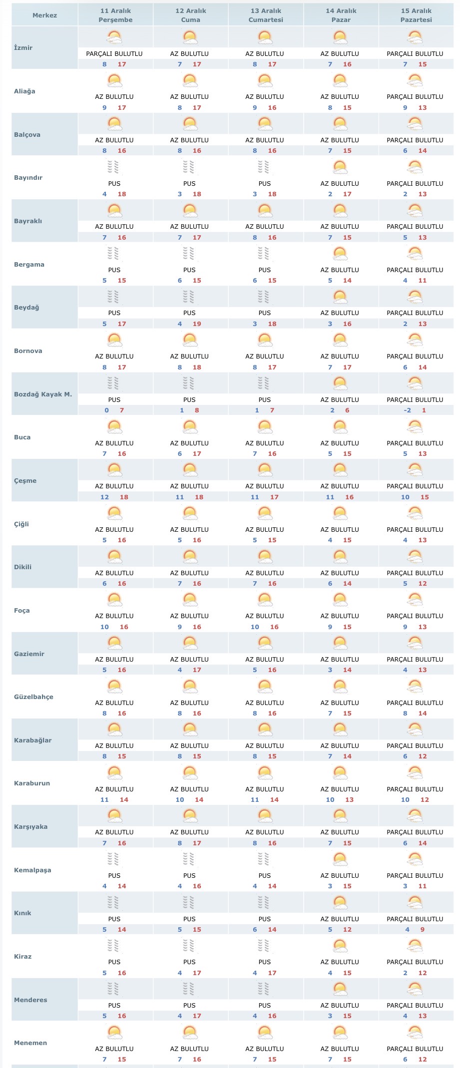 İzmir genelinde 11–15 Aralık tarihleri arasında hava çoğunlukla az bulutlu, yer yer puslu bir seyir izleyecek. Hafta boyunca sıcaklıklar il genelinde benzer değerlerde ilerlerken özellikle iç kesimlerde sabah ve gece saatlerinde pus etkisini gösterecek.