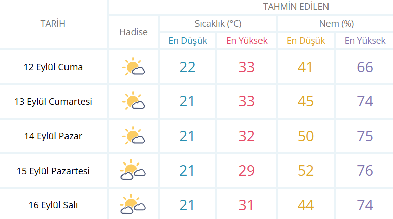 İzmir'in 5 günlük genel hava durumu tahmini ise şöyle: