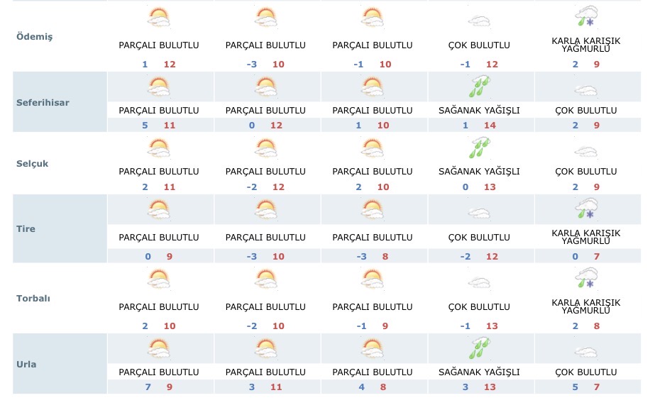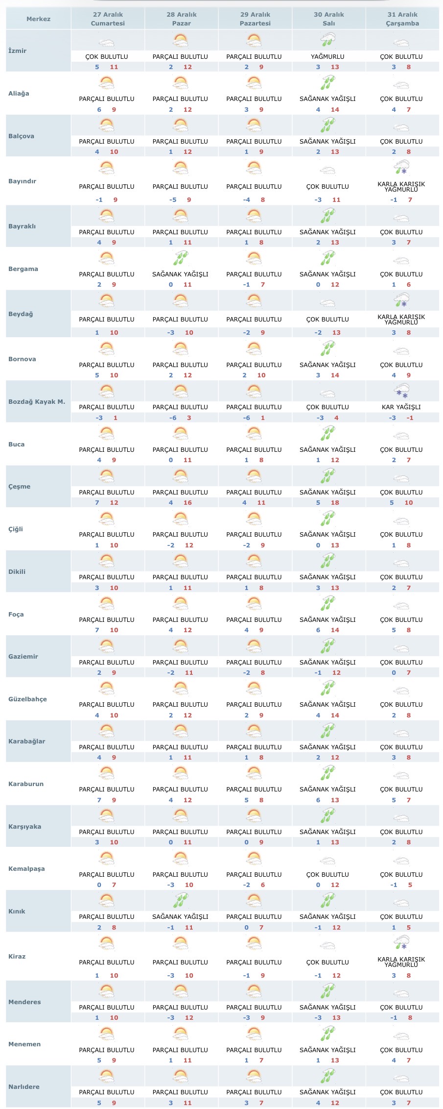İzmir genelinde önümüzdeki günlerde parçalı ve çok bulutlu hava etkisini sürdürecek. Meteorolojik verilere göre hafta sonu ve yeni haftanın ilk günlerinde kent genelinde bulutluluk artarken, özellikle salı günü birçok ilçede sağanak yağış bekleniyor. Kıyı kesimlerde yağışlar yağmur şeklinde görülürken, yüksek ve iç kesimlerde yer yer karla karışık yağmur ve kar yağışı ihtimali bulunuyor.