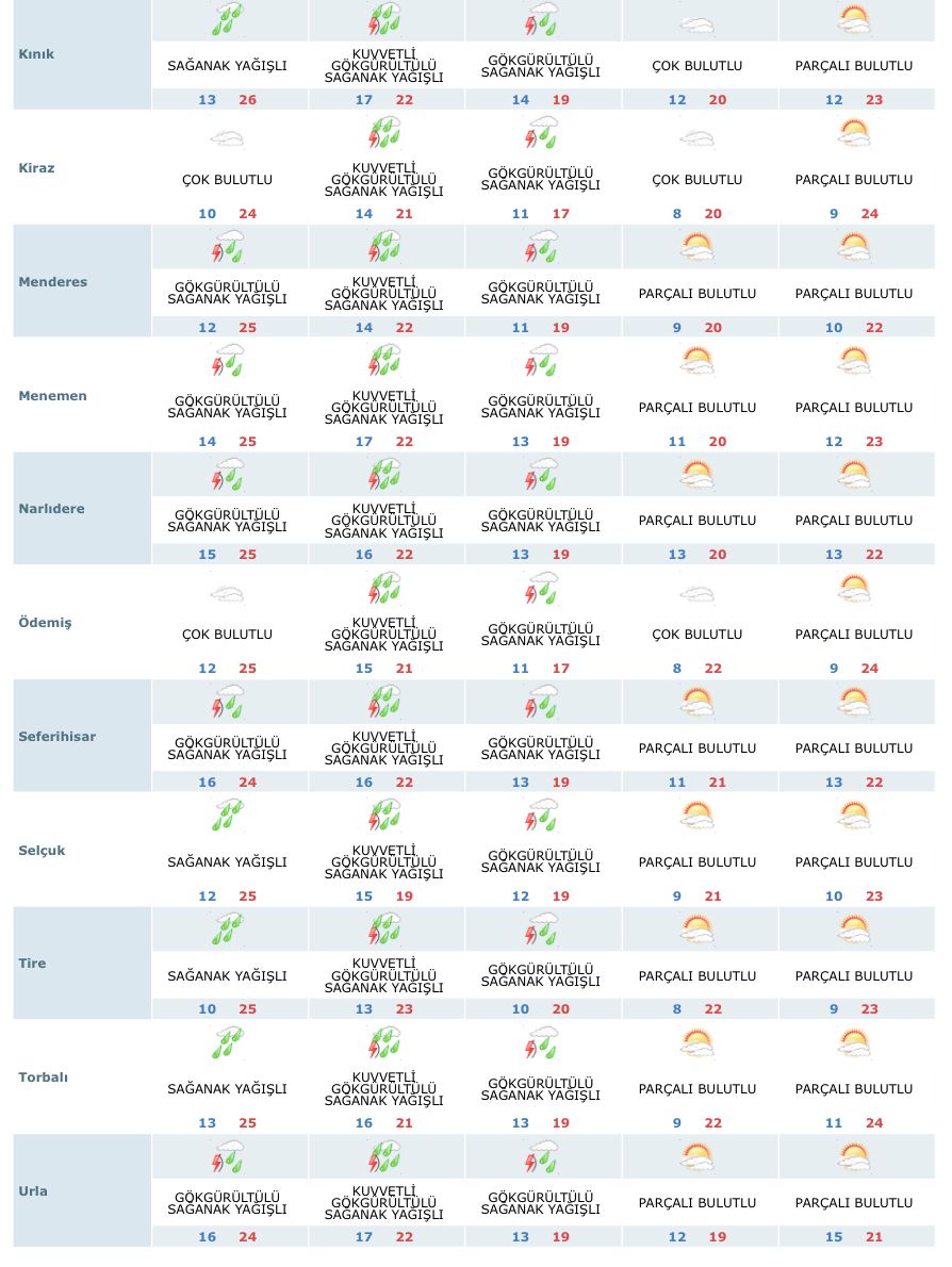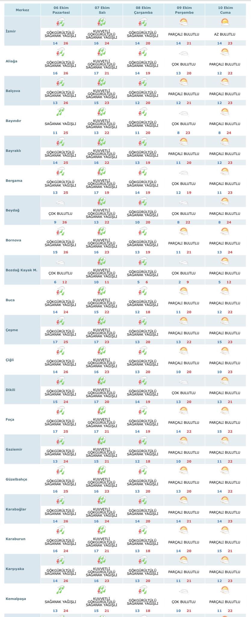 Metereoloji Genel Müdürlüğü İzmir'in ilçeleri için bir haftalık hava durumu tahminini yayımladı. Verilere göre hava sıcaklıklarının düşmesi beklenirken hafta başlangıcında şiddetli sağanak ve gökgürültülü yağış etkisini gösterecek. İşte İzmir'in ilçeleri için hava durumu tahminleri: