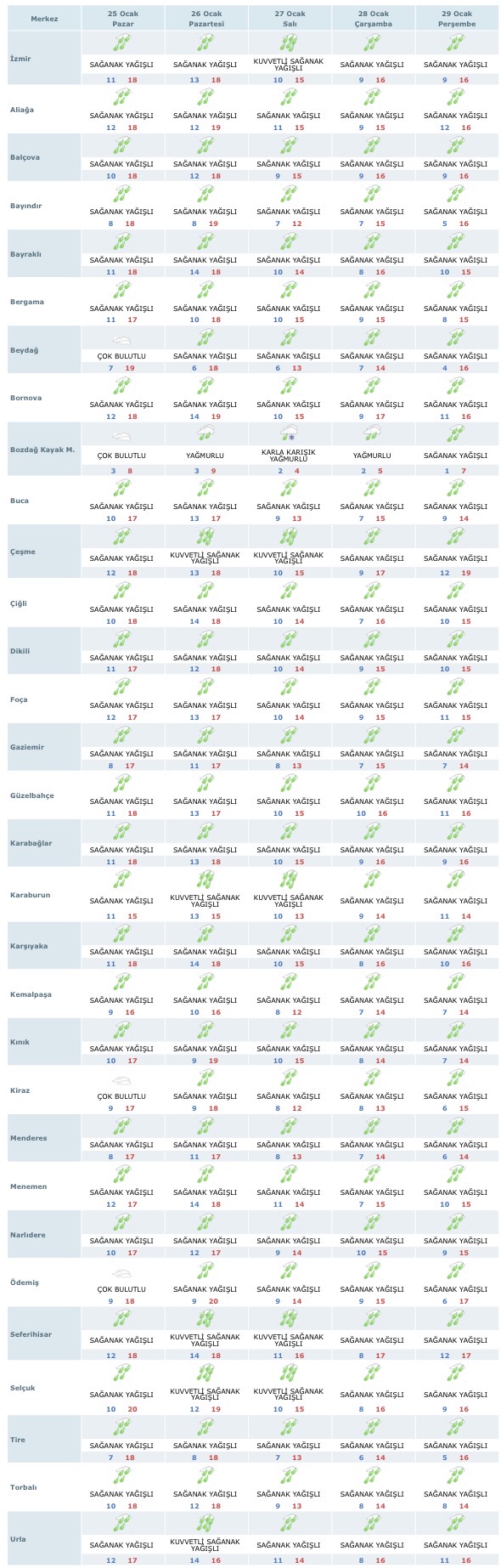 İzmir merkez başta olmak üzere Konak, Karşıyaka, Bornova, Bayraklı, Buca, Karabağlar, Gaziemir, Narlıdere ve Balçova ilçelerinde hafta boyunca sağanak yağış hâkim olacak. En yüksek sıcaklıklar 15–18 derece arasında değişirken, gece sıcaklıkları 7–11 derece seviyelerinde seyredecek. Çeşme, Foça, Urla, Güzelbahçe ve Karaburun gibi kıyı ilçelerinde salı günü kuvvetli sağanak yağış beklenirken, rüzgârın zaman zaman etkisini artırması öngörülüyor.