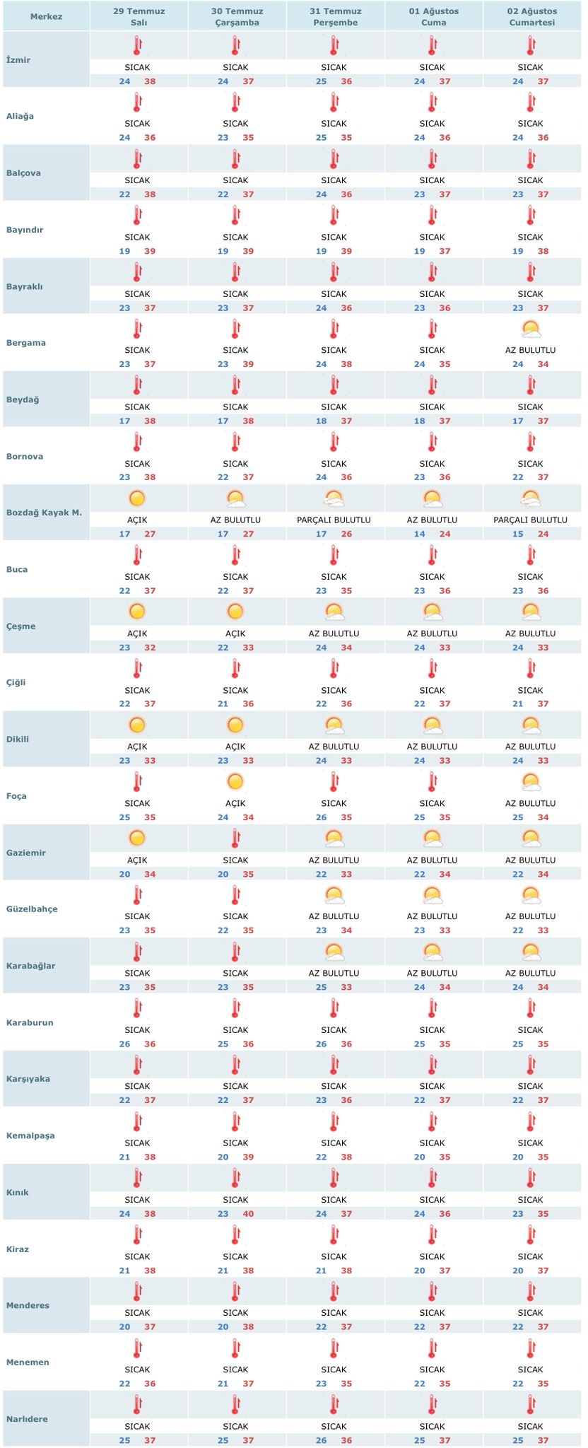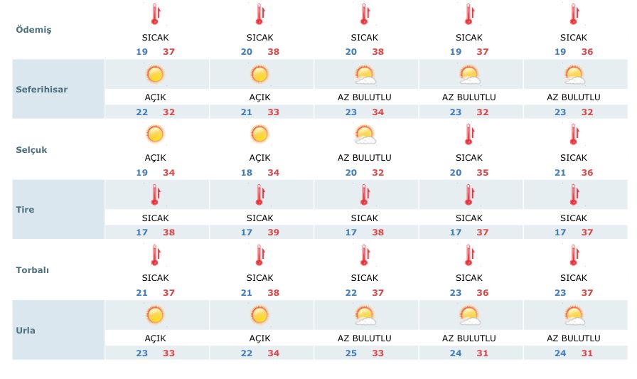Meteoroloji Genel Müdürlüğü’nün son tahminlerine göre hafta boyunca birçok ilçede hava sıcaklığı 35°C'nin üzerine çıkacak. Özellikle Buca, Bornova, Bayraklı, Karabağlar ve Gaziemir gibi iç kesimlerde hissedilen sıcaklık 40 dereceyi bulacak.