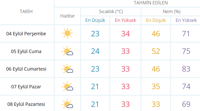 İzmir için 5 günlük genel hava raporu ise şöyle: