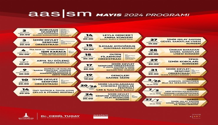 İzmir Büyükşehir Belediyesi, İzmirli sanatseverlere mayıs ayında yine renkli bir sanat programı sunuyor. Ahmed Adnan Saygun Sanat Merkezi (AASSM) yazı müjdeleyen ay içinde birbirinden güzel konser ve sergilere ev sahipliği yapacak.