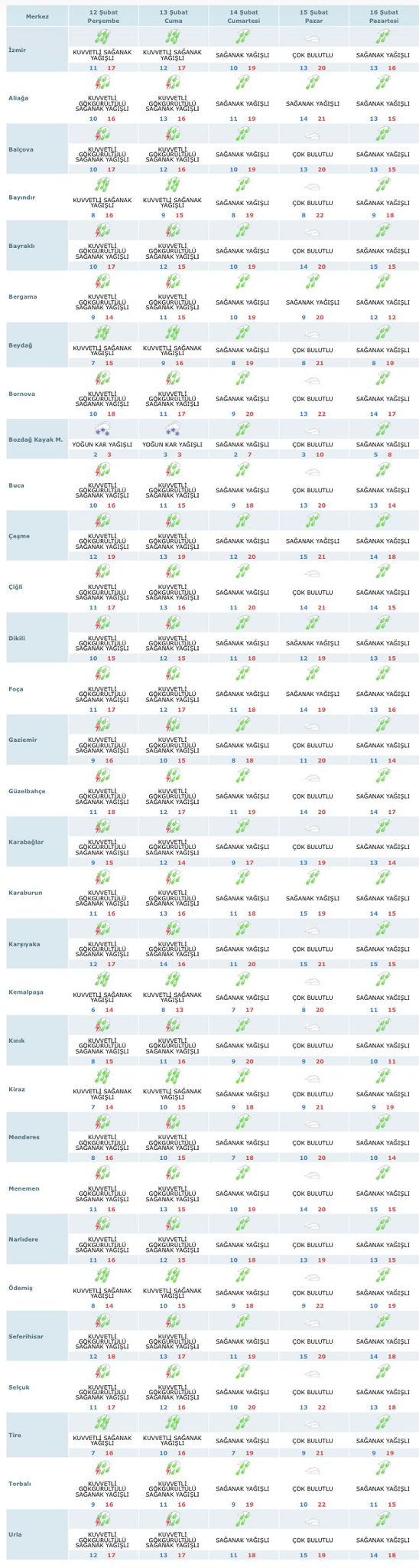 Perşembe ve Cuma günleri İzmir merkezde hava sıcaklıklarının 11-17 derece aralığında seyretmesi öngörülürken, Aliağa, Çeşme, Karşıyaka, Bornova ve Bayraklı gibi birçok ilçede kuvvetli sağanak ve gök gürültülü yağış etkili olacak. Yağışların zaman zaman şiddetini artırabileceği belirtiliyor. Vatandaşların ani su baskınları ve ulaşımda yaşanabilecek aksamalara karşı dikkatli olması isteniyor.