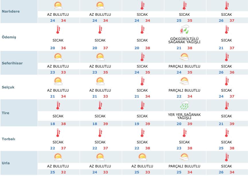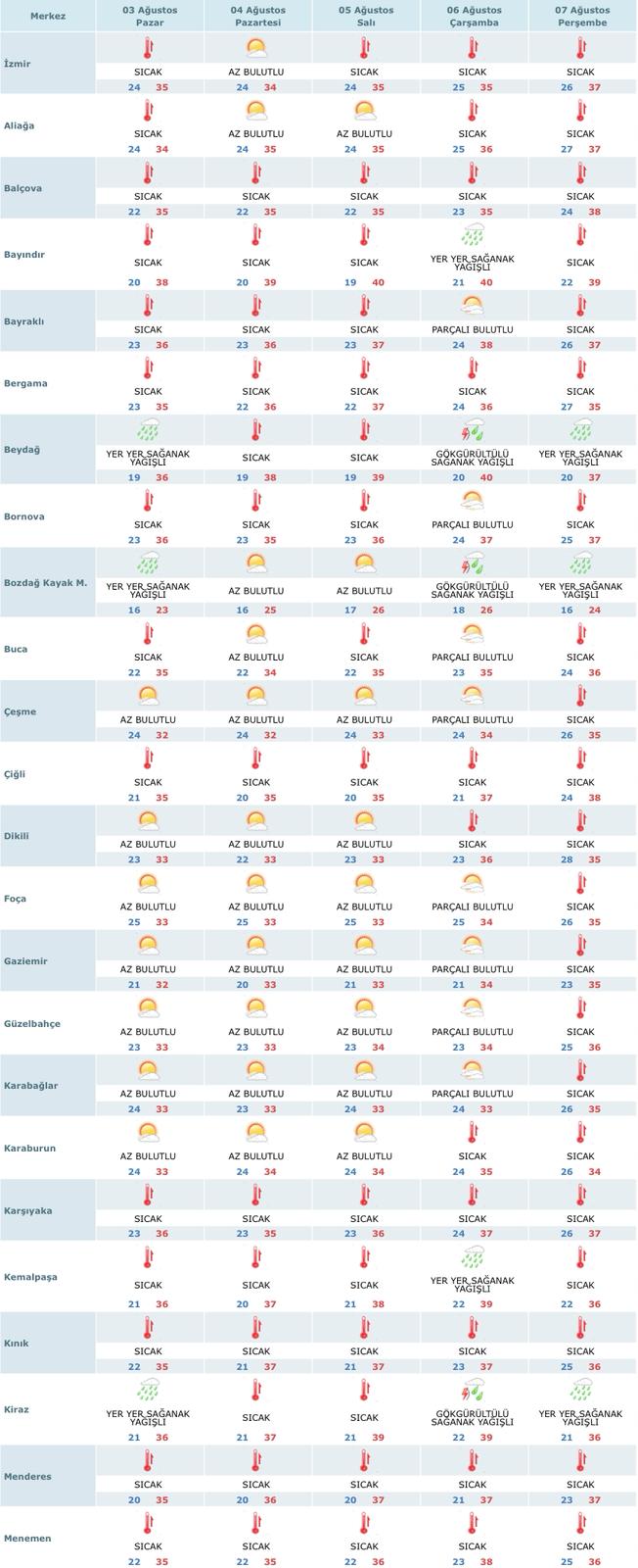 Kent genelinde sıcaklıklar mevsim normallerinin üzerinde seyrederken, bazı ilçelerde yüksek nem oranı ve yerel sağanak yağış uyarısı yapıldı. İşte İzmir'in ilçelerine göre hava durumu tahminler: