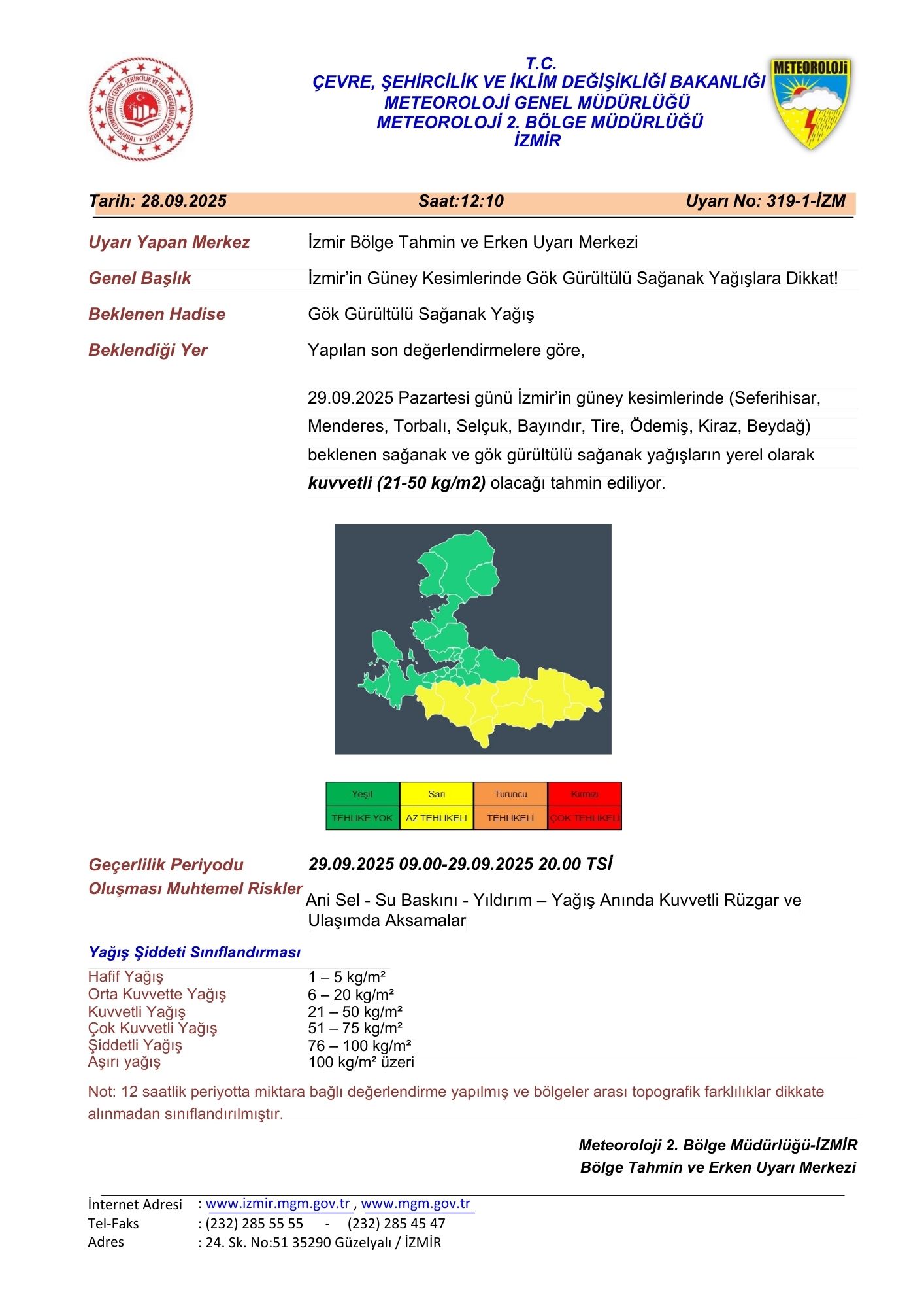 Meteoroloji Genel Müdürlüğü’nden yapılan açıklamada şu değerlendirmelere yer verildi: “29.09.2025 Pazartesi günü Aydın çevreleri ile İzmir ve Manisa’nın güney kesimlerinde yerel olarak kuvvetli sağanak ve yer yer gök gürültülü sağanak yağış bekleniyor. Ani sel, su baskını, yıldırım, yağış anında kuvvetli rüzgar ile ulaşımda aksamalar gibi olumsuzluklara karşı dikkatli ve tedbirli olunması gerekmektedir.”
