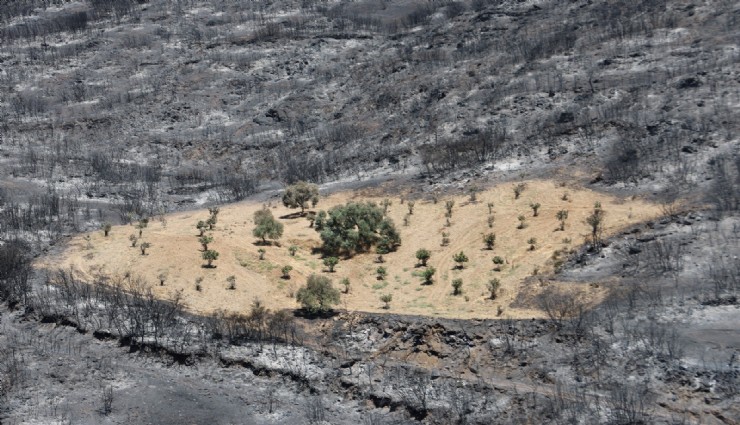 İzmir’in Ödemiş ilçesinde geçtiğimiz günlerde çıkan orman yangını, geniş bir alanı küle çevirirken, toprak adeta siyaha büründü. Yangın sonrasında oluşan simsiyah vadinin ortasında kalan zeytinlik bahçesinin ise alevlere geçit vermemesi dikkat çekti. Çevresi tamamen siyaha bürünen dağlık alanın ortasında kalan alan, toprağın sürülmesinin ve otlarının temizlenmesinin yangına karşı ne kadar etkili olduğunu bir kez daha ortaya koydu.