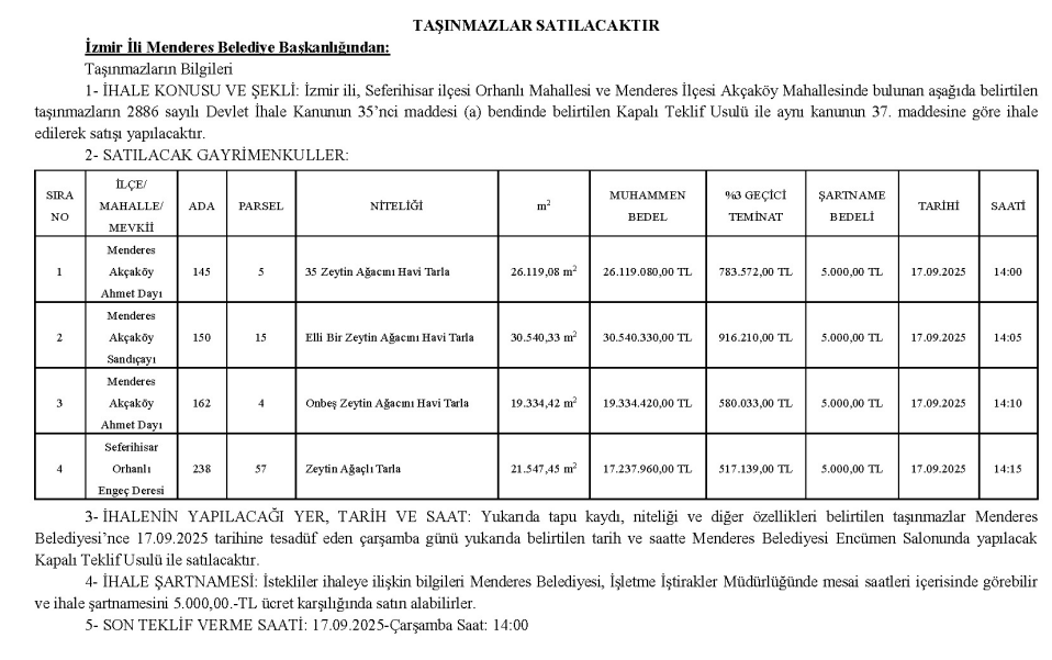 Menderes Akçaköy Mahallesi 150 ada 15 parsel: 30 bin 540 m² büyüklüğünde, 51 zeytin ağacı bulunan tarla. Muhammen bedel: 30 milyon 540 bin TL ile satışa çıkıyor