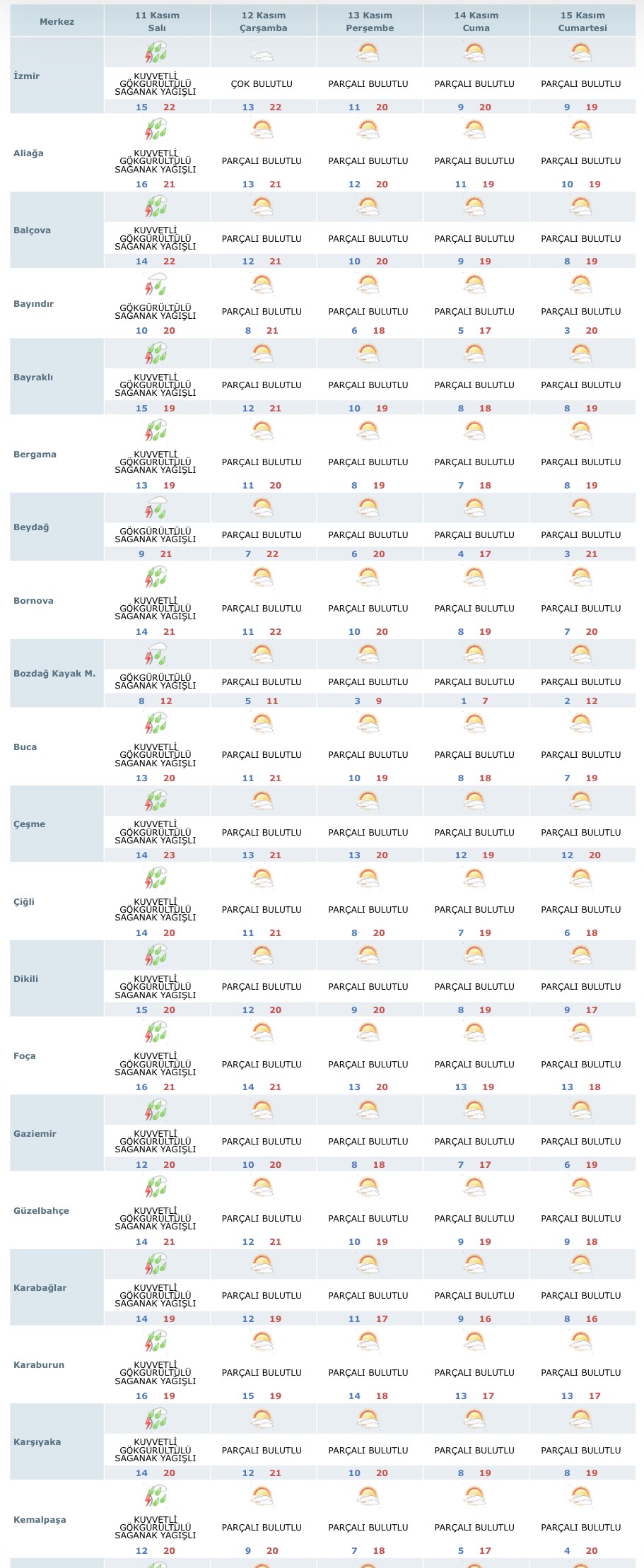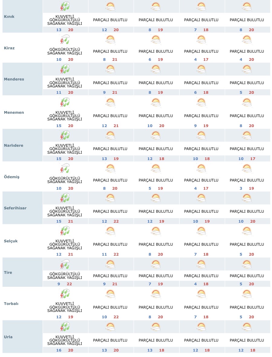 Meteoroloji Genel Müdürlüğü, İzmir genelinde bugün etkili olacak kuvvetli gök gürültülü sağanak yağış için uyarıda bulundu. Kıyı ve iç kesimlerde sabah saatlerinden itibaren başlayacak yağışların gün boyunca yer yer etkisini artırması bekleniyor. Sıcaklıklarda önemli bir değişiklik olmazken, yağışın ardından hafta boyunca hava parçalı bulutlu seyredecek. Yetkililer, ani sel, su baskını ve ulaşımda aksamalar gibi olumsuzluklara karşı vatandaşların dikkatli olmasını istedi.