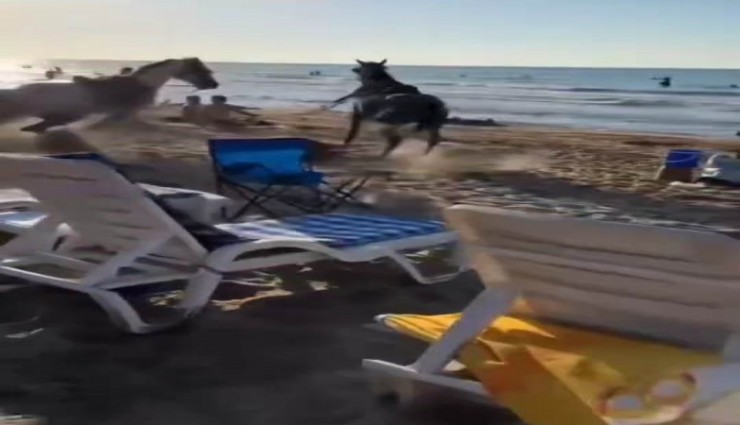 Olay, Şile’de bulunan bir plajda geçtiğimiz gün yaşandı. Edinilen bilgiye göre, iki genç sahibi oldukları atları plaja getirdi. Bir süre atların üzerinde plajda gezen gençler, atları ellerinden kaçırdı. Plajı birbirine katan atlar, yüzmek için plaja gelen yüzlerce insanın içine daldı. Sahil boyunca koşan atlar vatandaşları korkuttu. O anlar ise plajda yüzen bir vatandaşın cep telefonu kamerasına saniye saniye yansıdı. Vatandaşın cep telefonuna yansıyan görüntülerde iki atın, üzerindeki gençleri atıp bir anda yüzmek için plaja gelen vatandaşların arasına daldığı ve plaj boyunca koştukları görülüyor.