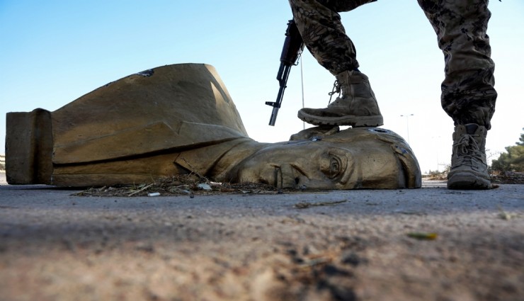 Suriye'de Esad ailesinin iktidar simgelerinden olan heykeller, muhalif askerler tarafından Şam'da yıkılıp, postallar altında ezilerek tarihe gömüldü.