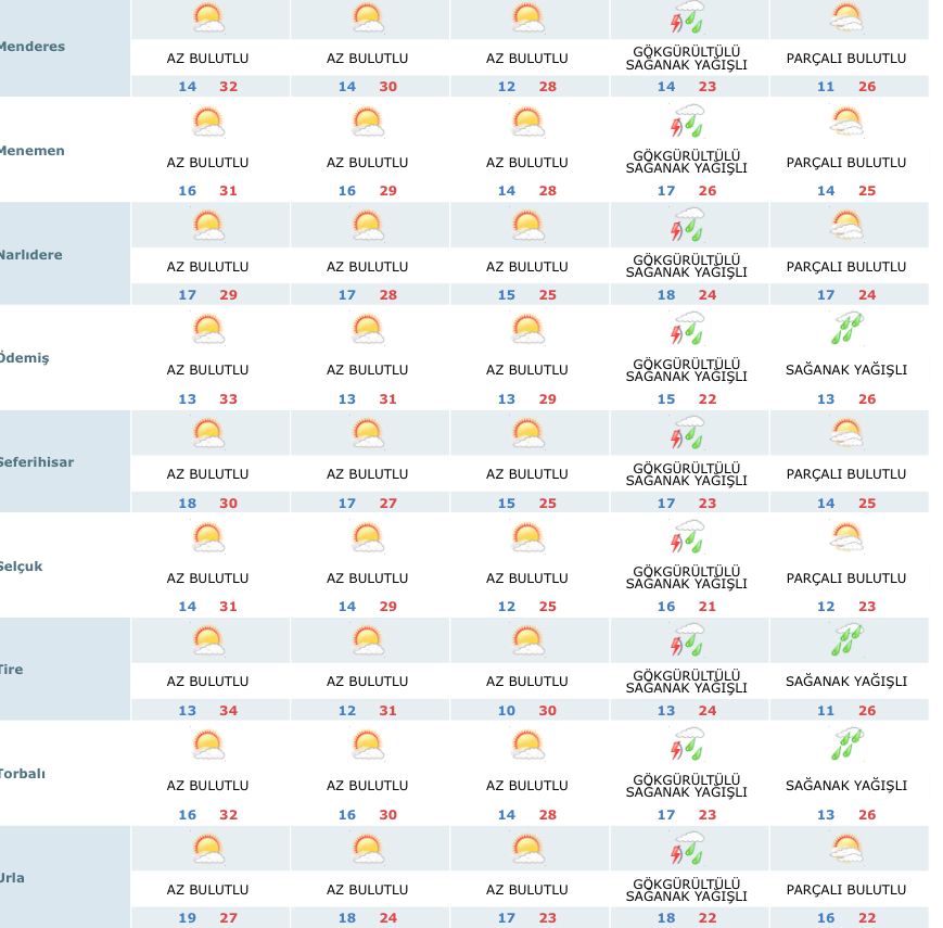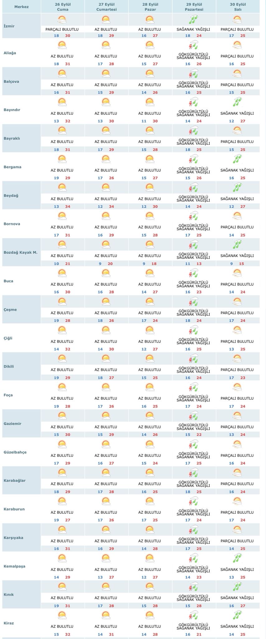 Meteoroloji Genel Müdürlüğü, İzmir'in ilçeleri için bir haftalık hava durumu tahminlerini yayımladı. Yazı kuraklık ile geçiren İzmir'de güneşli günler yerini serin ve yağışlı havalara bırakacak. Hava sıcaklıkları hafta içerisinde 8-10 derece arası düşecek. İşte İzmir'in ilçeleri için hava durumu tahminleri: