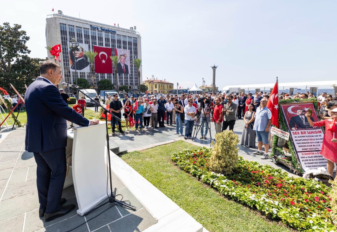 Törenin ardından CHP İzmir İl Sekreteri Tevfik Türk, Buca Cezaevi’nde tutuklu İl Başkanı Şenol Aslanoğlu’nun mesajını okudu. Mesajda, 30 Ağustos ruhunun teslim olmayanların, hak ve hukuk mücadelesi verenlerin ruhu olduğu vurgulandı. Tevfik Türk de “30 Ağustos’un ruhu, hapsedilemez. Bugün de her türlü baskıya, adaletsizliğe karşı dimdik ayaktayız” dedi.