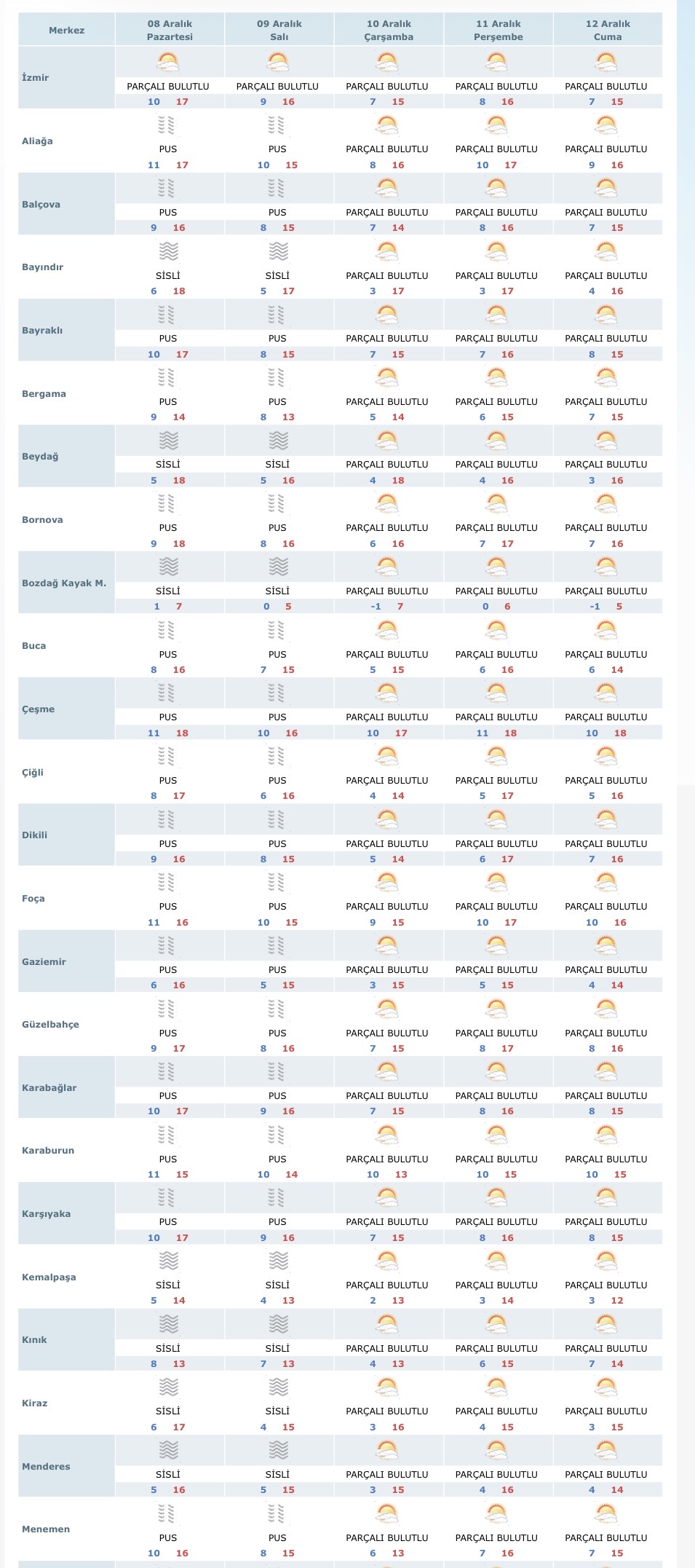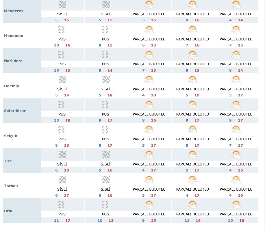 Çarşamba ve Perşembe günleri de benzer bir hava bekleniyor. Bayındır, Tire, Ödemiş ve Menderes’te puslu sabahların ardından gün içinde parçalı bulutlu ve yer yer güneşli hava etkili olacak. Cuma günü ise kent genelinde önemli bir yağış beklentisi bulunmazken sıcaklıkların 6–18 derece aralığında kalacağı öngörülüyor.